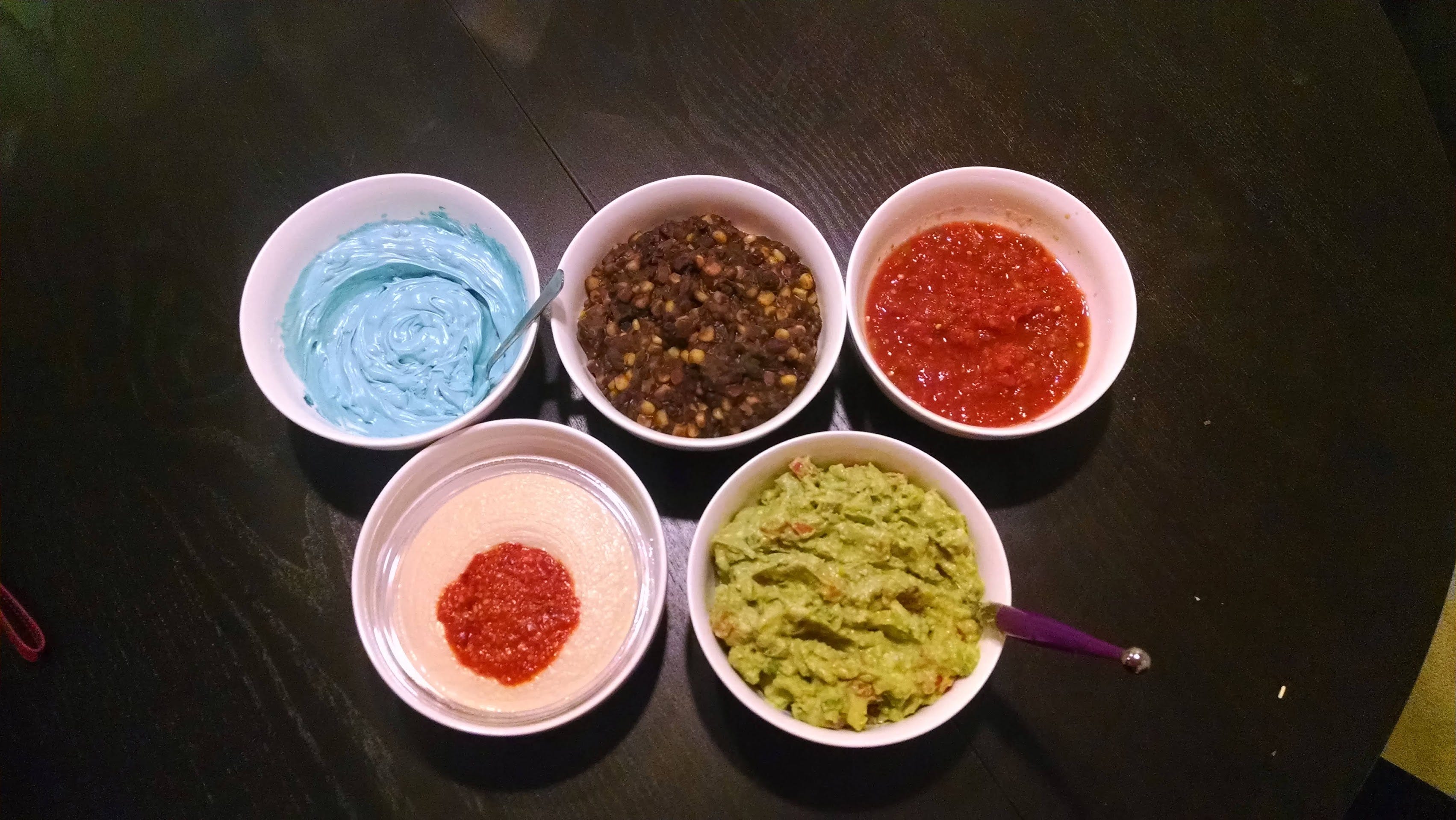 olympic rings dips, circa 2014: funetti frosting, black bean dip, salsa, hummus, guac